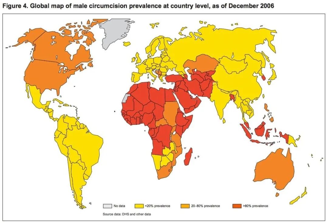 上图来源:Male circumcision: Global trends and determinants of prevalence, safety and acceptability". World Health Organization. 2007.
